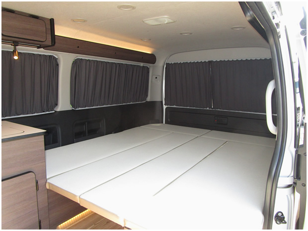 それに合わせたリアの専用ベッドレイアウトで多目的に車内アレンジが楽しめます。もちろん室内下地断熱から遮光タイプの専用カーテンも標準装備。同じく標準装備の調光式の各種LED照明も好評をいただいております。