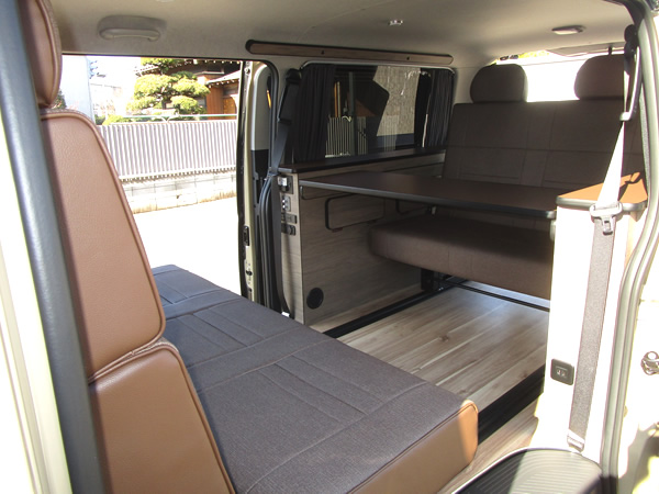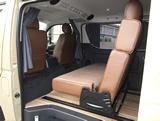・REVO ST1300oセカンドシート ・REVO TB1000oサードシート ・専用ヘッドレスト4箇所(ST×2 TB×2) ・上部ベッドマット(4枚式テクセル製) ※ベッドサイズ上部1500(1080)o×1550o 下部1300(1000)o×2400o ・フロア架装(重歩行用CF) ※ロングスライドレール2750o埋込 ・左ハイカウンター(Cコンロ収納付) ・右ハイカウンター(簡易給排水10L付) ・天板パネル(移動式テーブル) ・リア6面プライバシーシェード(遮光タイプ) ・下地断熱施工(壁・天井) ・走行充電式サブバッテリーシステム ※12V 100Ah 専用12Vコンセント付 ・AC100V外部入力コネクター ※2口コンセント+5mケーブル付属 ・天井ダウンライト照明(LED調光式) ・ルーフサイド間接照明(LED調光式) ・その他