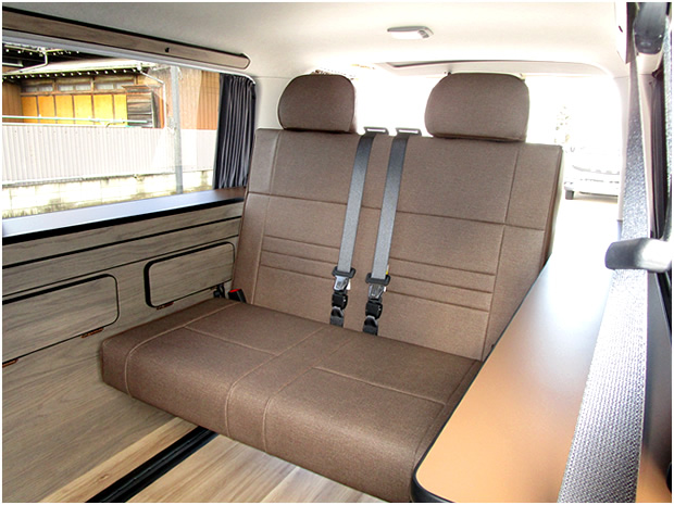 良質なリビングを実現するため、セカンドシートには背面マット架装を施したSGL純正シートを採用しました。 乗車時の快適性はもちろんのこと、必要に応じてベッドスペースを拡張できる仕様になっております。