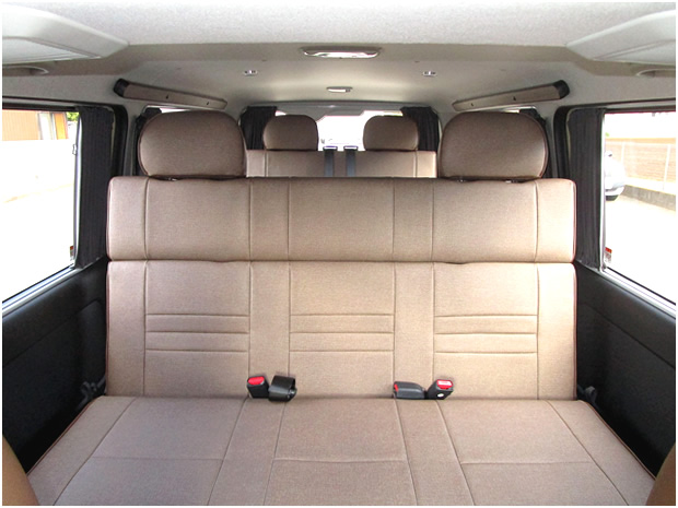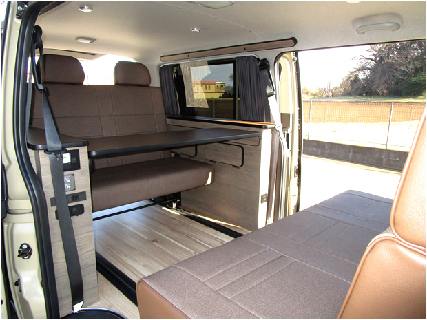 大人数が前向き乗車出来る3列シートレイアウトを基本とし、車中泊バンコンさらには趣味のトランスポーターとして「1台3役」を可能にする人気のレイアウトです。