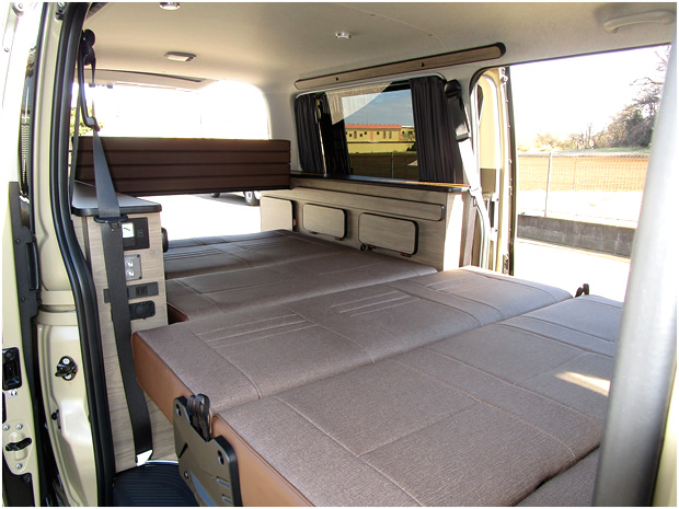 「限られた車内空間を最大限に活用出来る事」をテーマに、広々とした対面ダイネット形成、脱着可能な完全フラットの2段ベッドレイアウト、さらには大容量カーゴスペース等、あらゆるシチュエーションでの使い勝手の良さを「簡単な展開」で出来るレイアウトとしました。