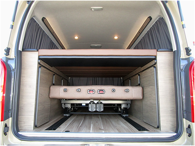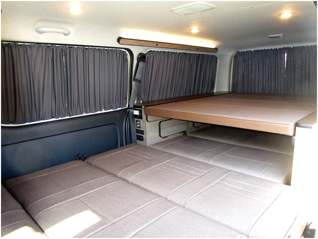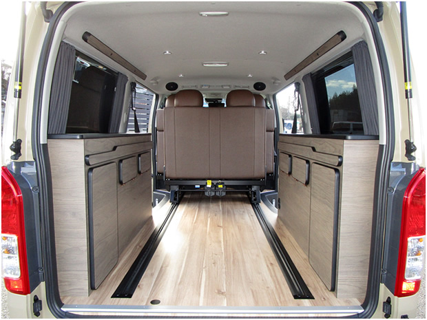 メインがロングスライドレール採用の3列シート仕様のため、簡単な展開で「ドライブレイアウト・対面ダイネットレイアウト・フルフラットベッドレイアウト」を可能にし、2列シートを格納する事で、2mオーバーのカーゴスペースも確保、貨物としての機能も残す事が出来ました。